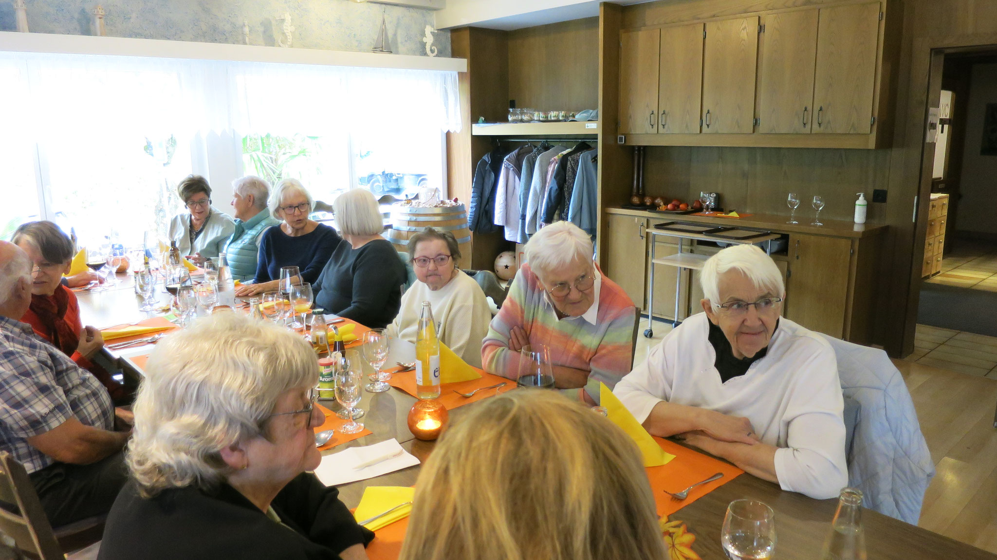 Um 11.30 fanden sich die 31 angemeldeten Jahrgängerinnen und Jahrgänger in der Möve ein, wo ihnen ein Apéro ausgeschenkt wurde. Ab 12.00 Uhr startete das freundliche Personal den Service für das Mittagessen, bestehend aus einer Bouillon, Rahmschnitzel mit Nüdeli/Frites und Edelgemüse.